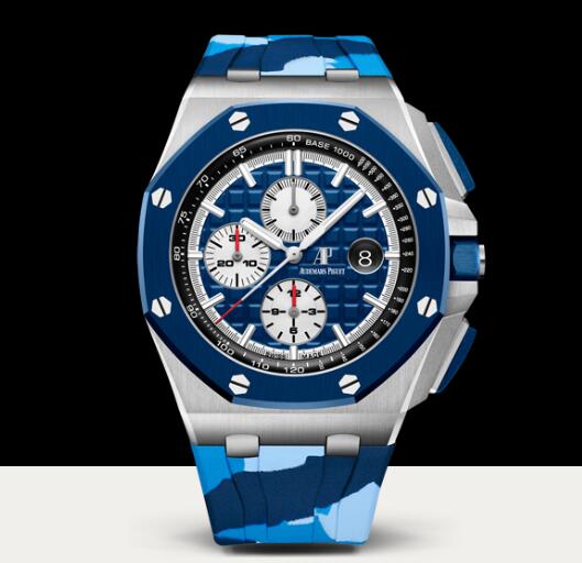 Blue dial with “Méga Tapisserie” pattern, rhodium-toned counters, rhodium-toned external zone, white gold applied hour-markers and Royal Oak hands, black inner bezel.