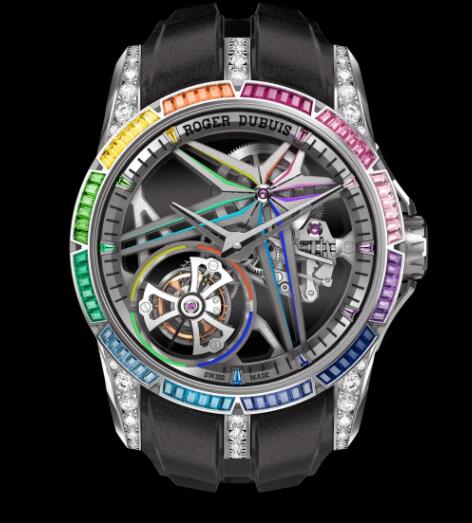 CaseWhite Gold* case with round-cut diamonds on lugs and sides White Gold* bezel set with baguettes cut rainbow color stones White Gold* Crown Sapphire crystal with anti-reflective coating White Gold* open case back with smoked sapphire crystal *White gold 750/1000
