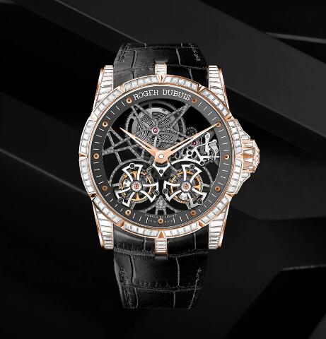 Roger Dubuis Excalibur Skeleton double flying tourbillon Haute Joaillerie RDDBEX0406 Replica Watch Rose gold Flying tourbillon