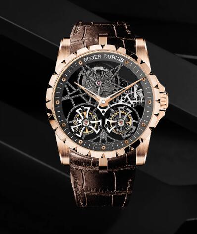 Roger Dubuis Excalibur Skeleton double flying tourbillon RDDBEX0395 Replica Watch Rose gold Flying tourbillon camo strap cover