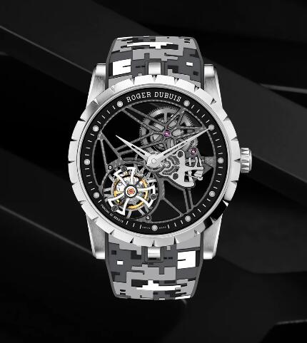 Roger Dubuis Excalibur Skeleton flying tourbillon RDDBEX0393 Replica Watch White gold Flying tourbillon camo strap cover